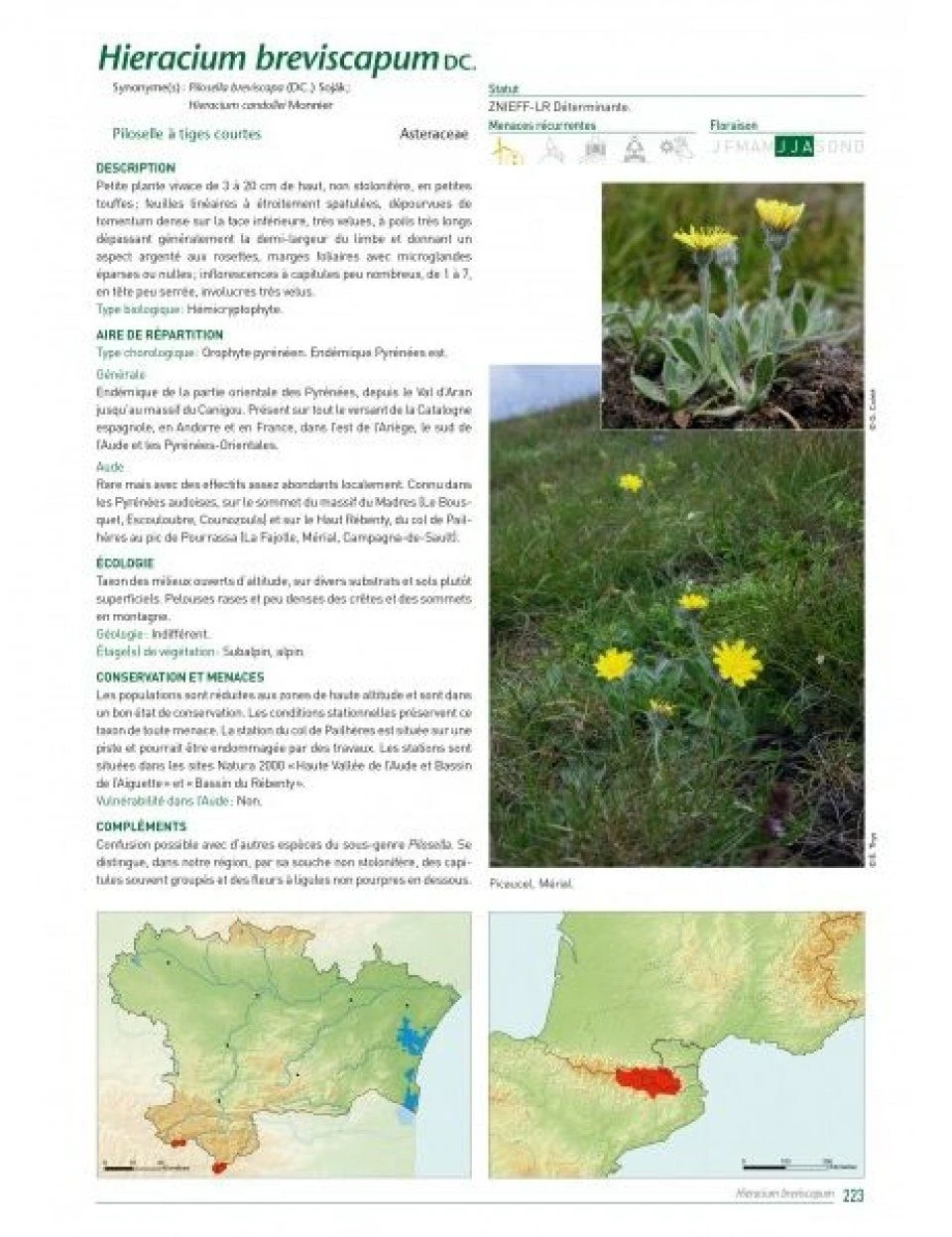 This impressive work opens with a detailed presentation of the department of Aude (history of its local botany, biogeographical context, main natural environments, ecology and conservation issues) and continues with a presentation of more than 300 plants (description, general distribution, distribution in Aude, ecology, conservation and threats, protection status, phenology, detailed map, etc.).