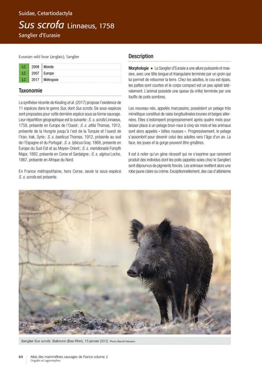 This atlas includes protected species benefiting from reintroduction programs as well as native and exotic species that may be harvested and/or demonstrate an economic or biological impact. All of them may exhibit strong spatial and numerical fluctuations. Monitoring programs have been in place for decades for many of them. This distribution atlas draws on 310,000 data points collected between 2000 and 2018. Therefore, this book represents an essential tool to resolve the conflict between species conservation and human activities through concerted management.