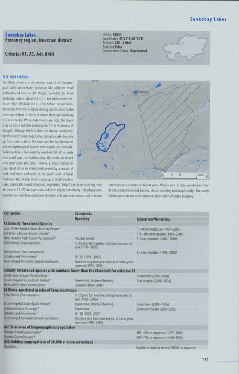 This book is the first inventory of Important Bird Areas (IBA) in Kazakhstan. The basic principles of the IBA programme, its justification and the methodology used for IBA identification are described. The results of the IBA inventory and its relations to nature conservation in Kazakhstan are presented, the accounts for 121 IBAs identified in Kazakhstan which form part of the Central Asia IBA programme are given. In the appendices, the full lists of species for IBA criteria applying and other key items are provided.