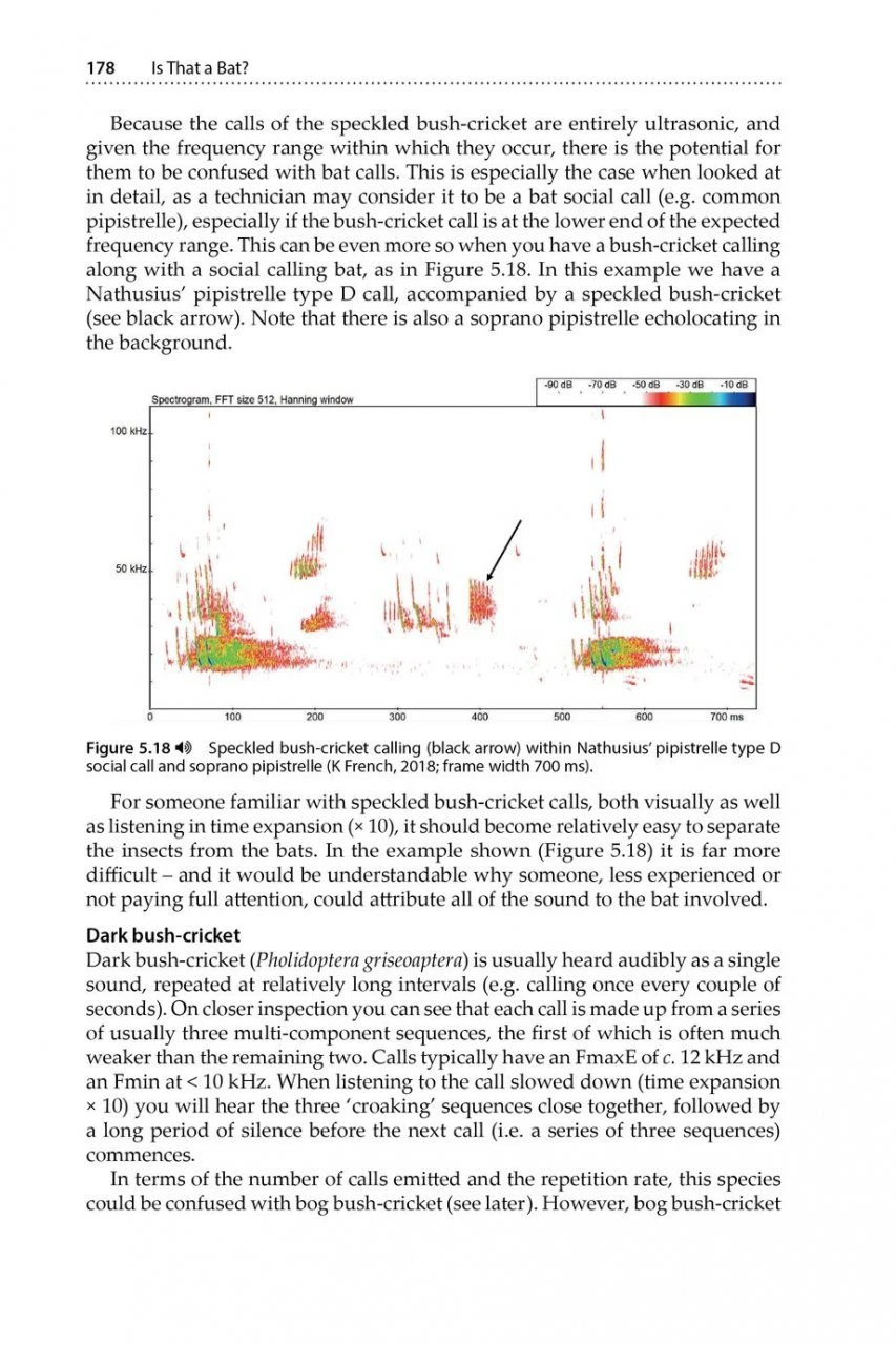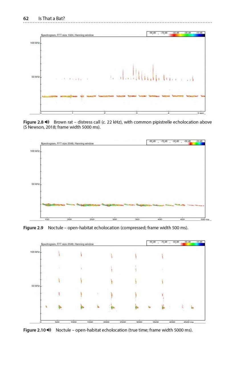 Those carrying out analysis can be distracted, intrigued or delayed owing to the occurrence of recordings that are unfamiliar and not identifiable to them. These recordings can relate to ‘difficult to ID’ bat species, but also, often, sounds not related to bats. This can be especially true when noise triggers such as insects, small mammals or birds look like bat-related noise. Therefore, only knowing what bats sound like is not enough. It is extremely useful to know what other sources of noise look and sound like within the same soundscape. This resource will help bat workers, in whatever environment they are in, to be more confident in recognising, categorising and dismissing other sounds. Is That a Bat? includes a substantial downloadable sound library (in .wav format) that readers can listen to by ear or process through sound analysis software.