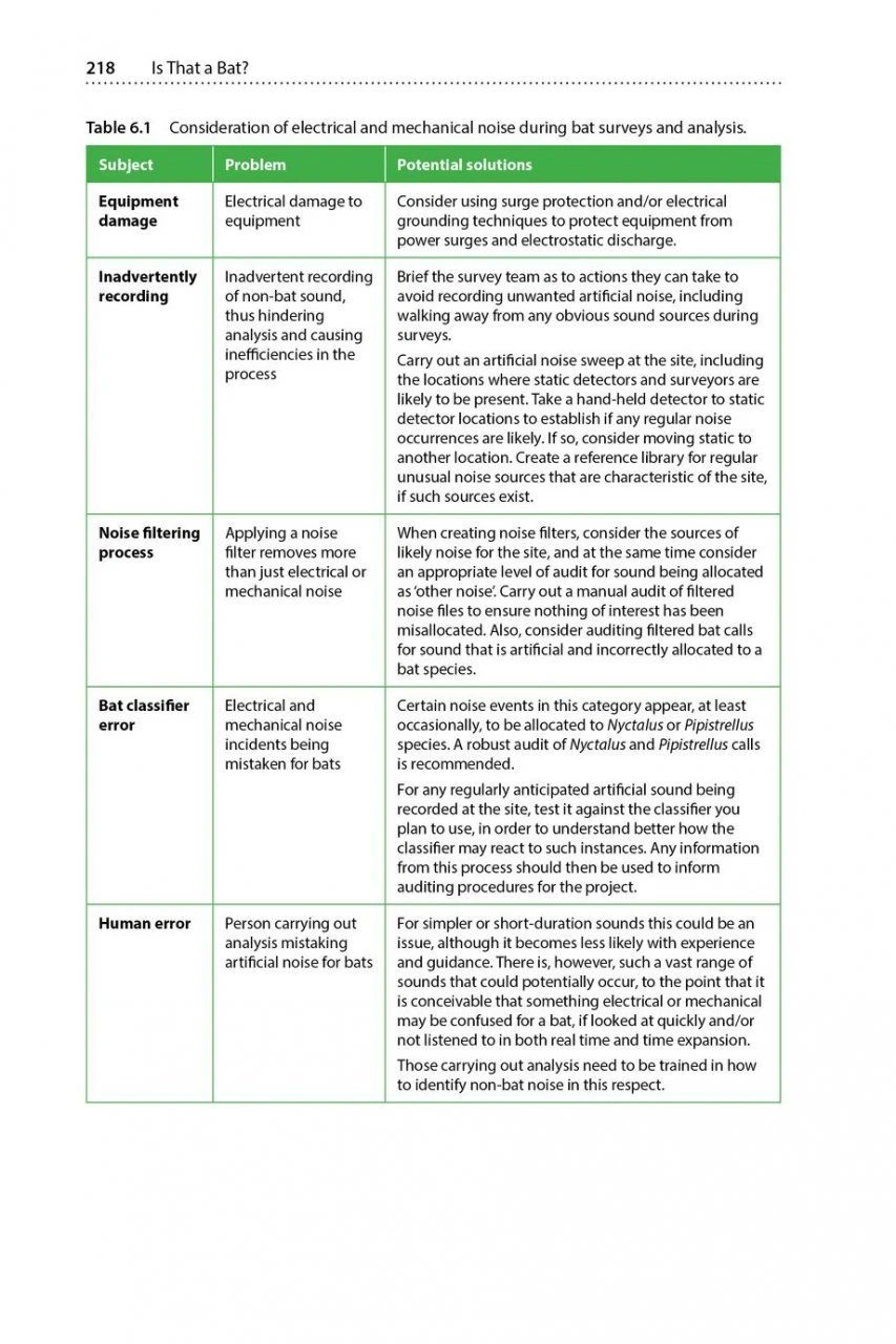 Bat detector surveys are carried out by ecological consultants, researchers, conservationists and hobbyists. Understanding and categorising non-bat sounds in surveys offers the potential of knock-on benefits for informing development projects (e.g. other important records discovered within a site), as well as the possibility of associated conservation benefits. In recent years the number of people carrying out these surveys and recording calls with bat detectors has grown considerably. These surveys often generate vast amounts of audio recordings, resulting in the heavy workload associated with completing the sound analysis and reporting process.