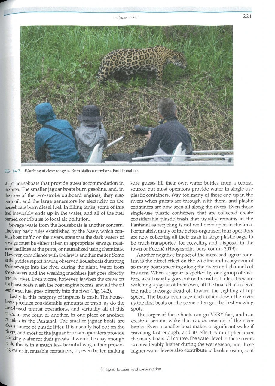 Jaguars of the Northern Pantanal: Panthera onca at the Meeting of the Waters details the lives and behaviours of this subpopulation of jaguars through one-of-a-kind photographs from 26 international photographers, as well as illustrations, maps, waypoints, scientific insights, field journal excerpts and personal narratives. These jaguars are the largest in the world because they eat enormous prey and these jaguars have also become habituated to human observation. The book seeks to understand how locals can coexist with these cats while benefitting financially from them through ecotourism. It provides a conceptual model to apply to other subpopulations in order to save jaguars throughout North and South America.
