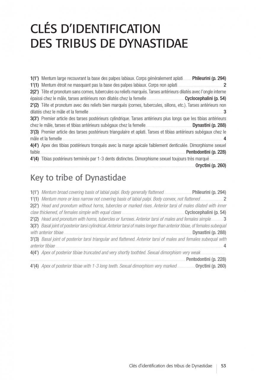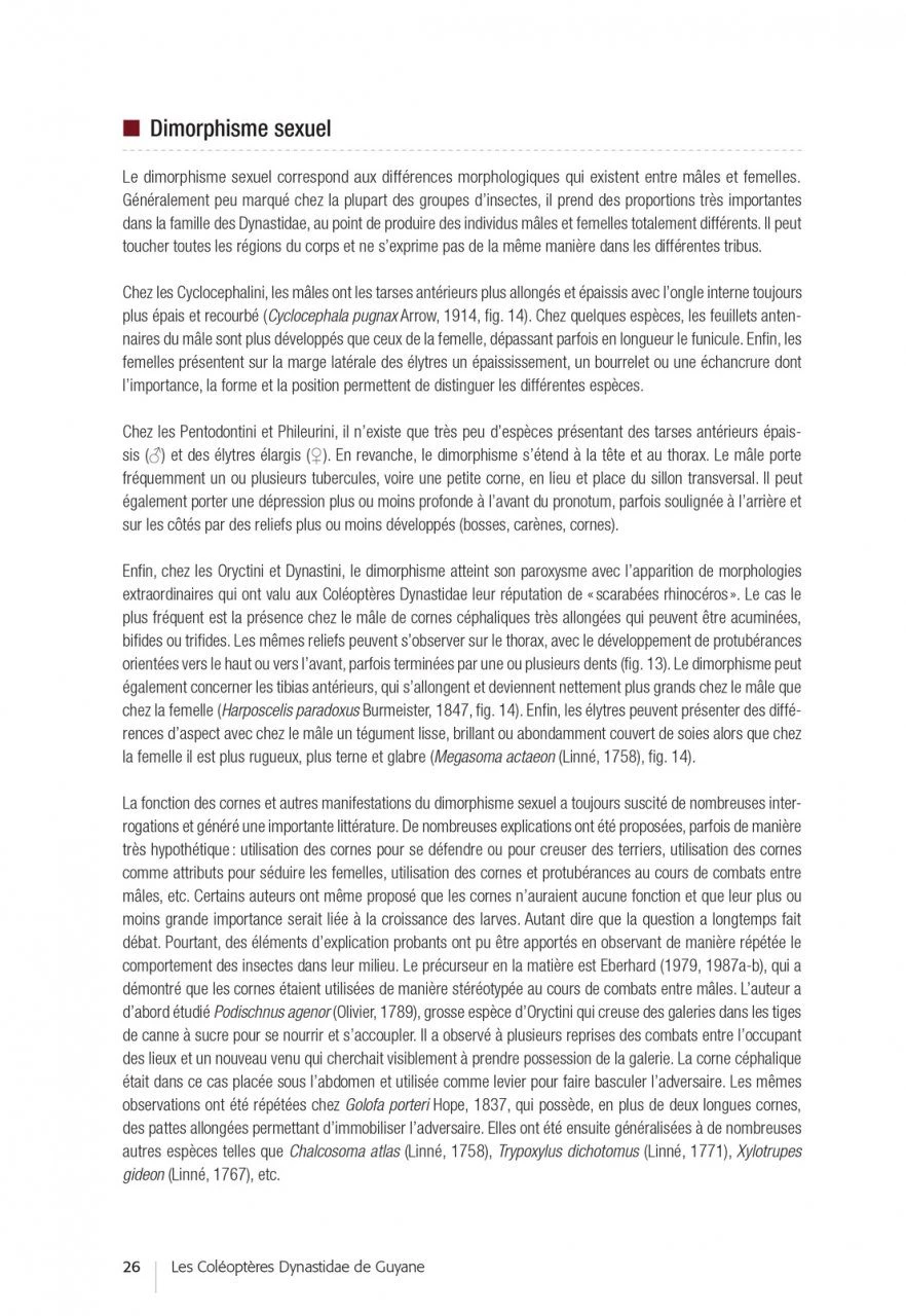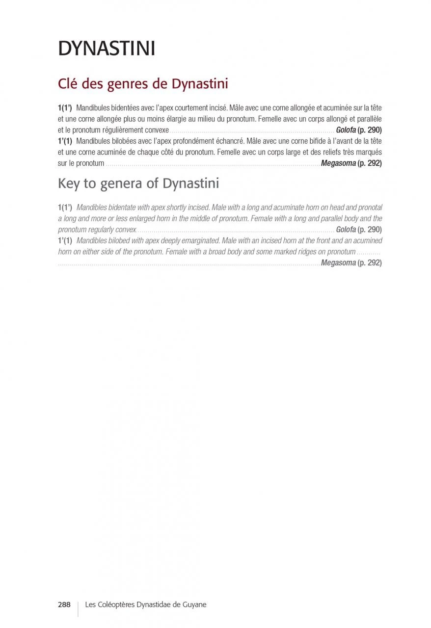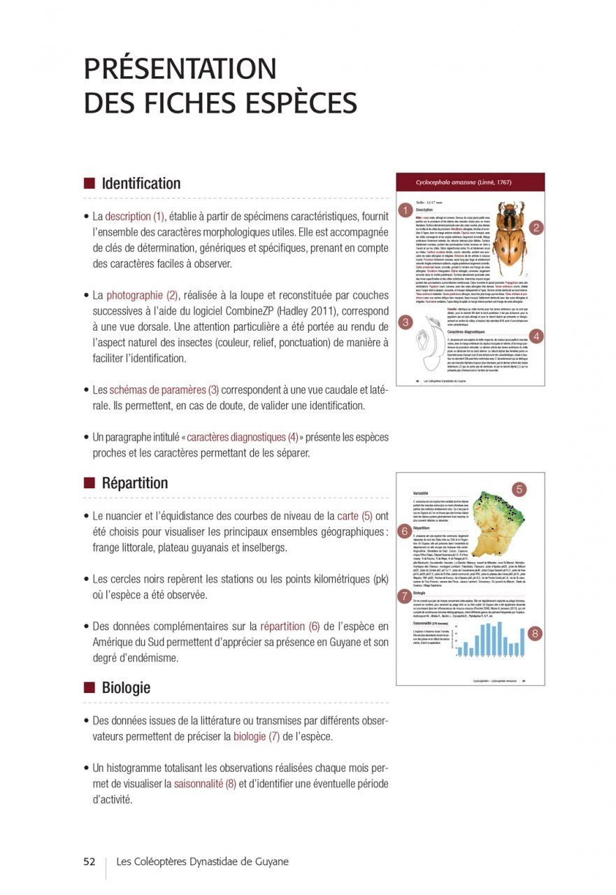 After an introductory part devoted to the biology of the Dynastidae, their environment and the methods of observation and collection, the authors propose determination keys (in French and English) and very complete descriptive sheets for each of the species (accompanied by essential habitus photos and diagrams of traits allowing to validate the identifications carried out). In the final part, the authors draw up the results of this inventory, highlighting certain sampling gaps and opening up prospects for future prospecting and research work.