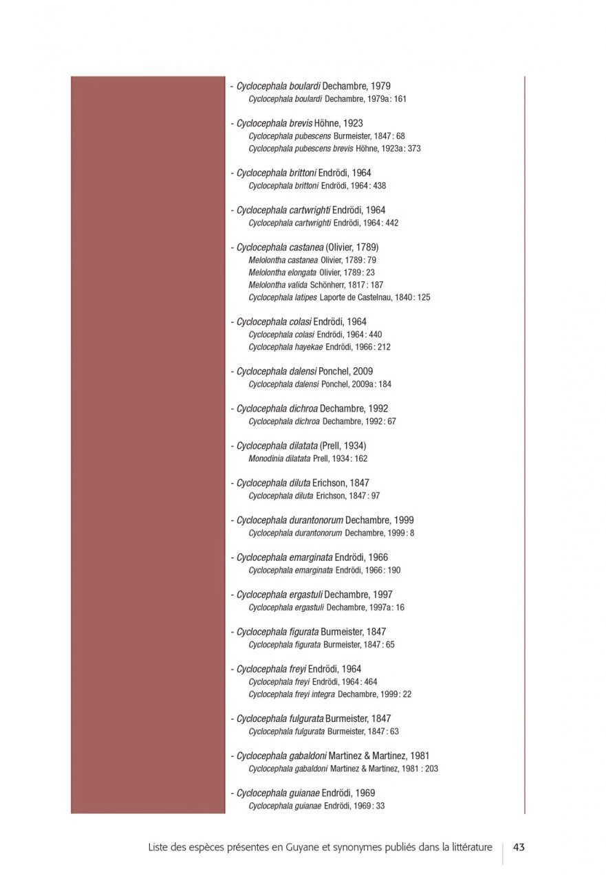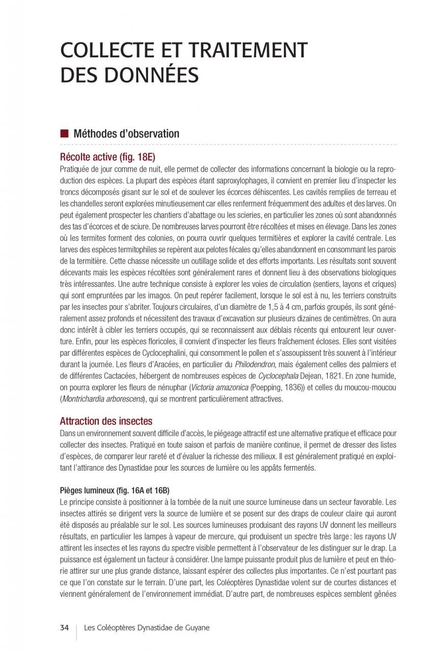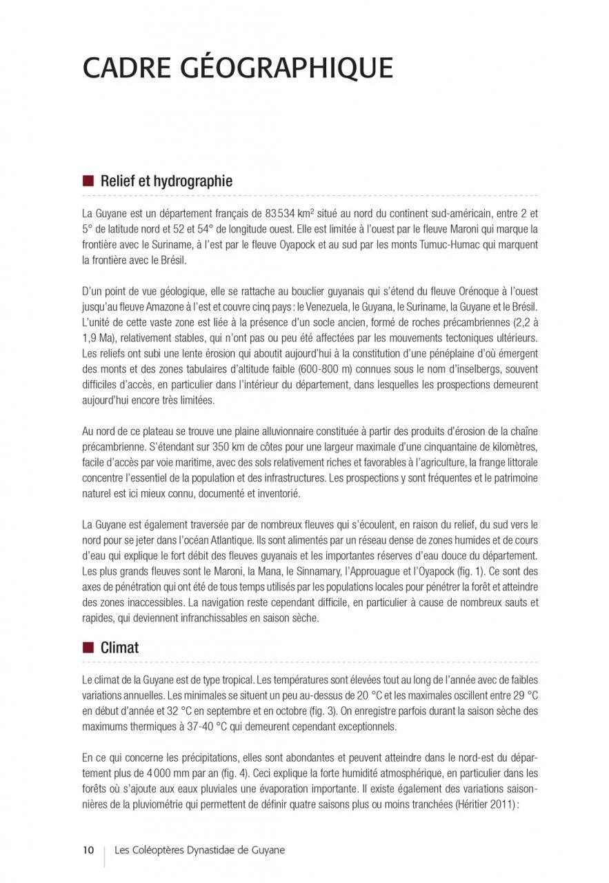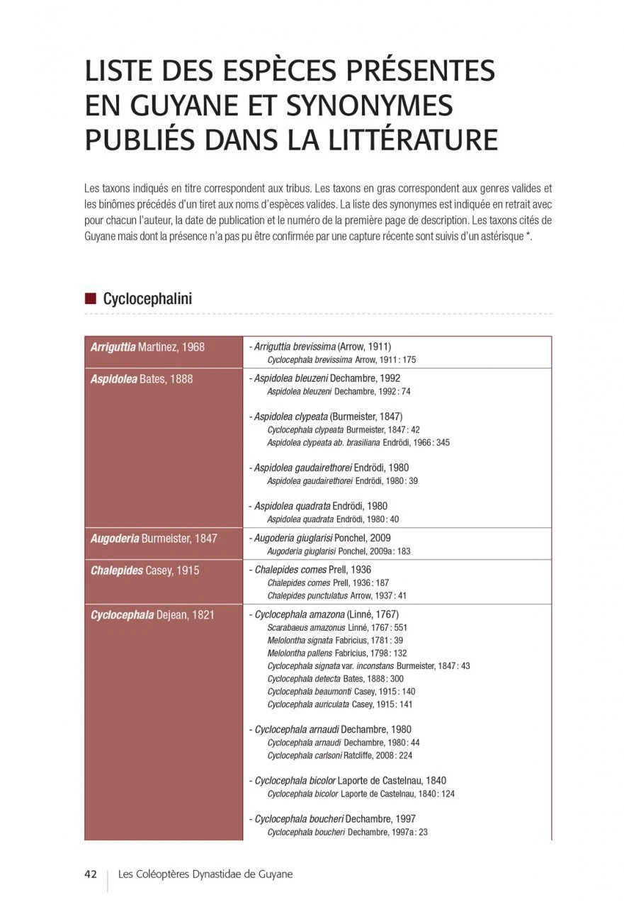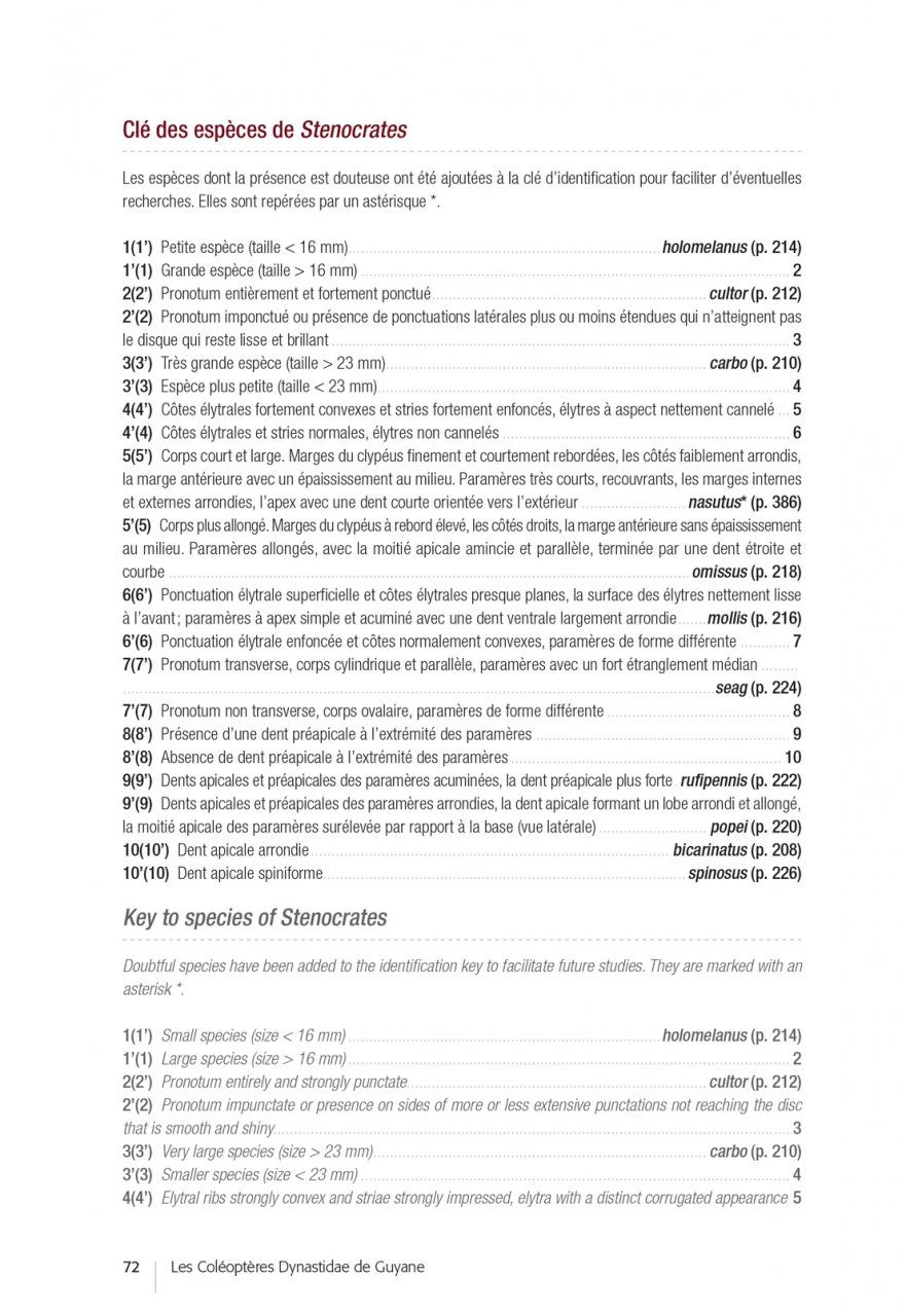 After an introductory part devoted to the biology of the Dynastidae, their environment and the methods of observation and collection, the authors propose determination keys (in French and English) and very complete descriptive sheets for each of the species (accompanied by essential habitus photos and diagrams of traits allowing to validate the identifications carried out). In the final part, the authors draw up the results of this inventory, highlighting certain sampling gaps and opening up prospects for future prospecting and research work.